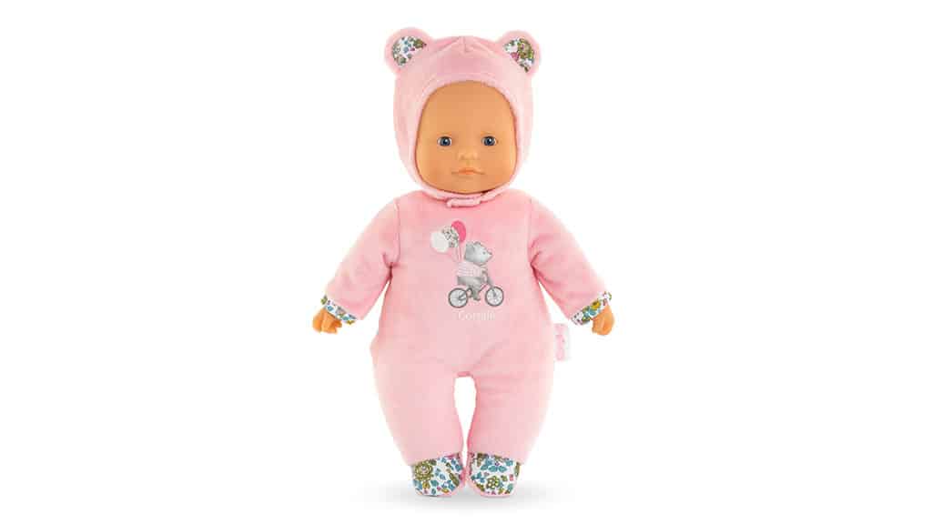 This 12-inch child doll is calmly scented and completely weighted for little fingers. It comes with a sewn-on outfit and a detachable matching cap.
