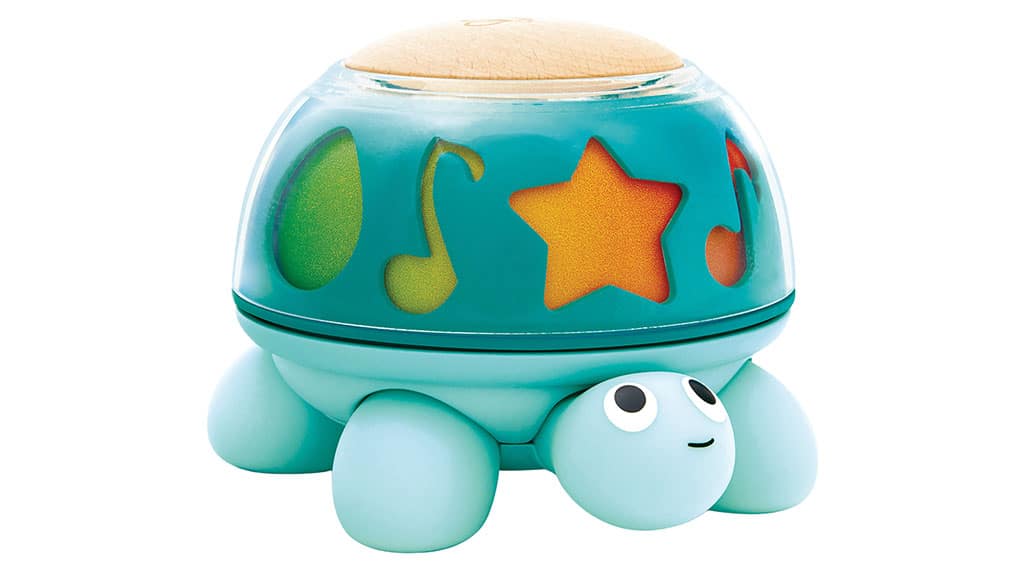 The musical turtle incorporates a rotating shell, comfortable legs, and performs candy, soothing music.