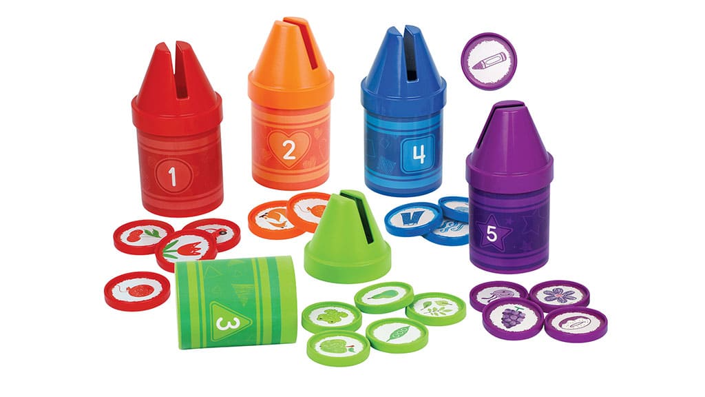 Little ones construct colour recognition and matching expertise utilizing these numbered crayons and double-sided cash, dropping every coin into the crayon’s slotted high.
