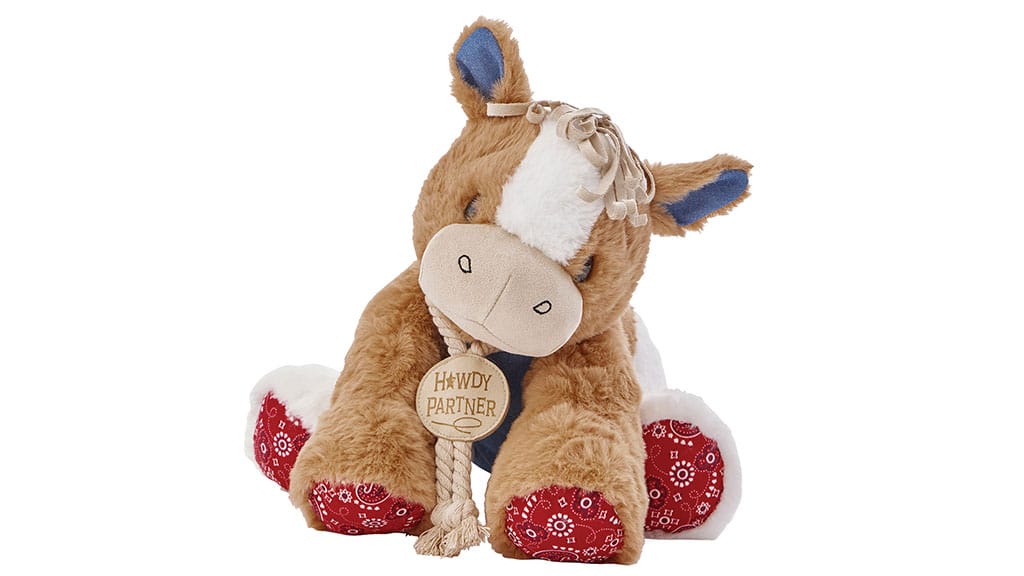 Little ranchers can saddle up with these six plush pals, together with a highland cow, canine, unicorn, bear, and horse, styled with bandanas, cowboy hats, and denim.
