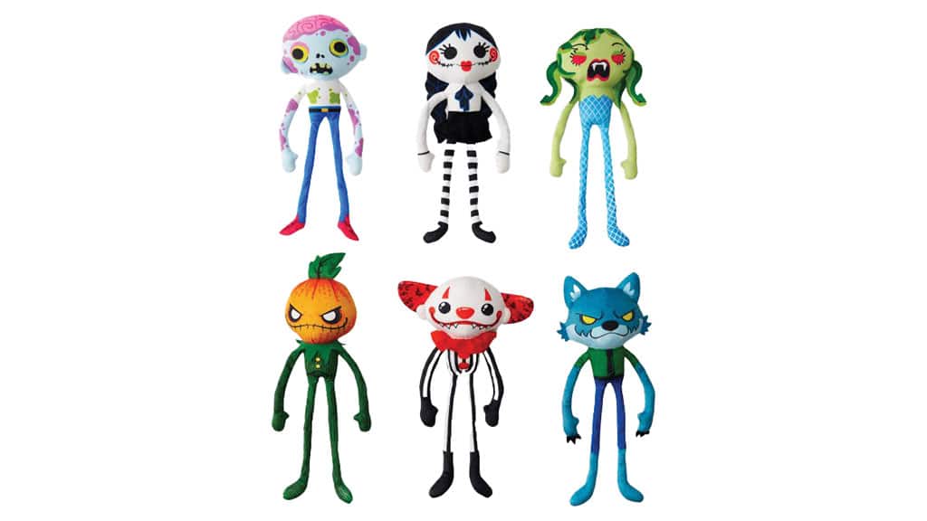 These spooky-cute plushies characteristic exaggerated legs and arms, embroidered faces, and a clip.