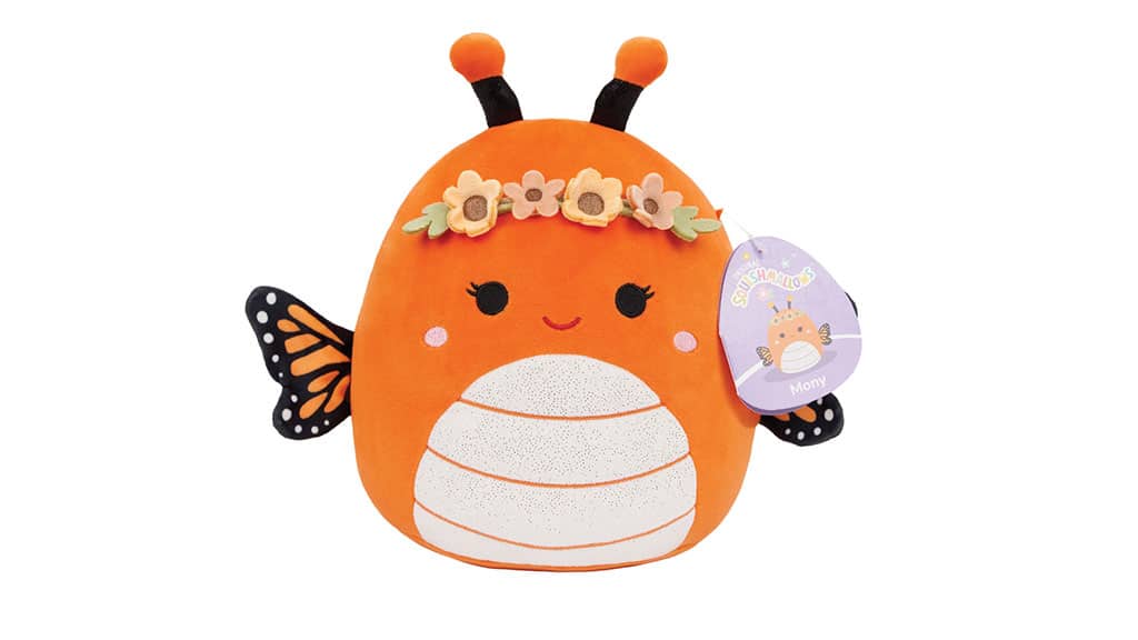 Mony, the 8-inch orange monarch butterfly Squishmallow, has attractive wings and a glittery stomach, and wears a trendy flower crown.