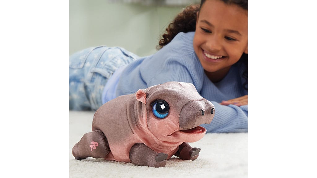 Sally, the mini-hippo, wants assist studying to stroll. Youngsters can feed her a fake watermelon slice for a snack, and press her again to observe her waddle.