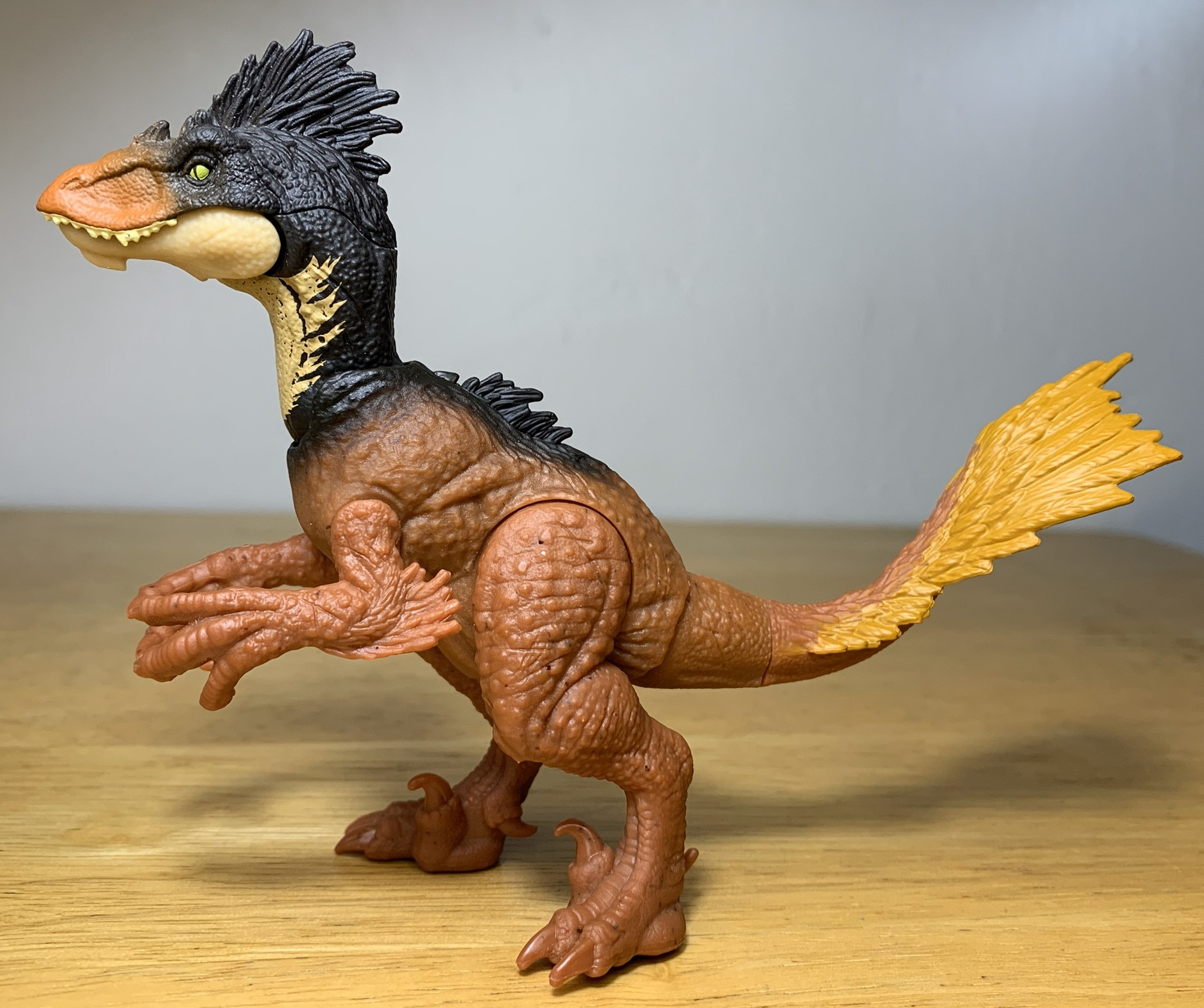 The determine is rust orange coloured with a peach coloured jaw and throat and black coloration operating alongside the highest of the top, down the neck, and onto the again. The tail feathers are tangerine orange. The enamel are white, the tongue is pink, and the eyes are inexperienced with unpainted, elliptical pupils. I like the mixture of black and completely different orange tones; it provides the toy an autumnal high quality. A number of the paint utility on the enamel is sloppy and it could after all have been higher if the claws have been painted.