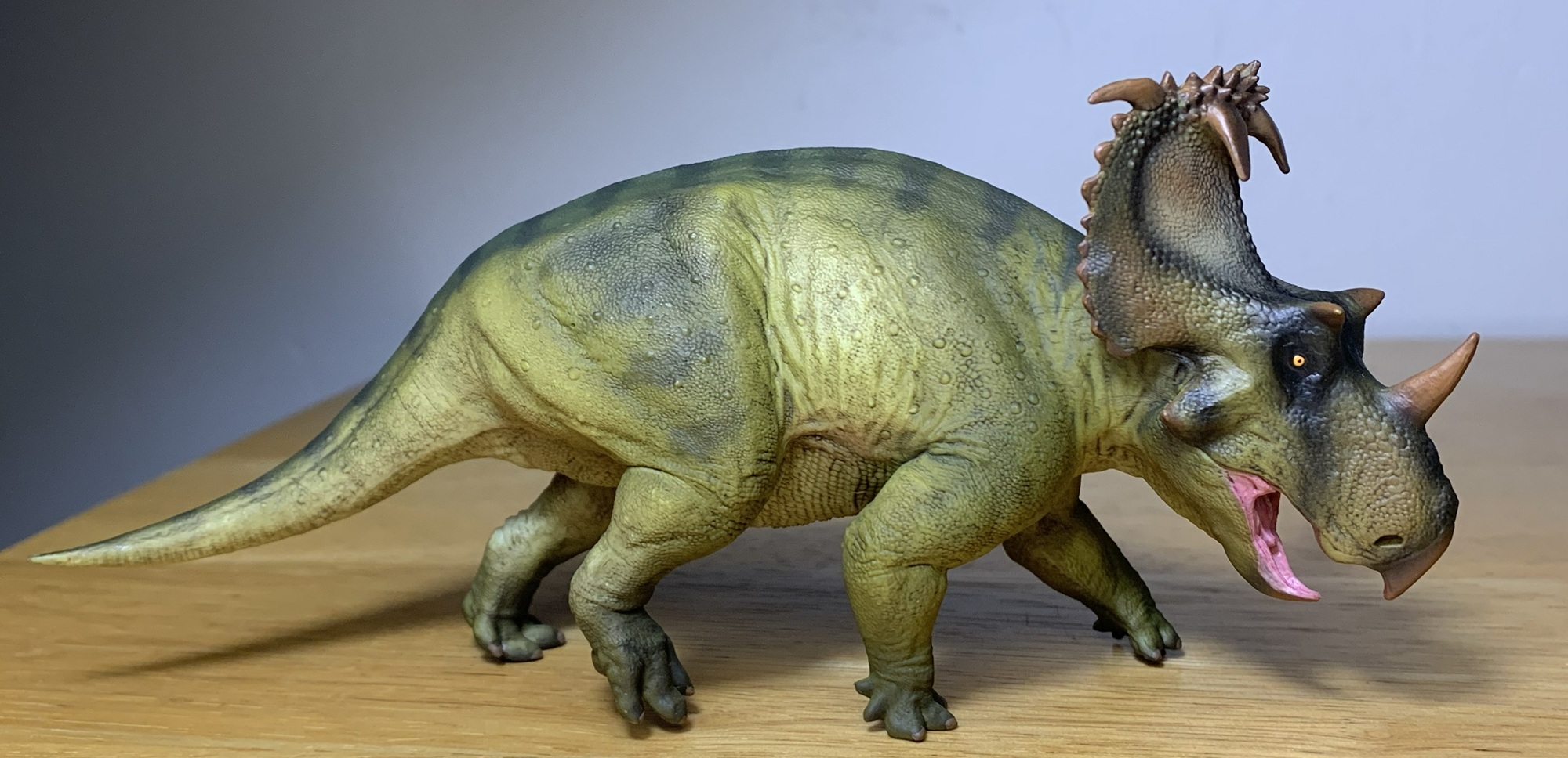 The determine is painted with a mix of forest inexperienced tones which might be rather more aesthetically pleasing than the muddy browns of the Centrosaurus. The determine is darker dorsally and paler alongside the flanks, again of the frill, and underside. The darkest tones are used as patterning throughout the face and frill and delicate striping runs down the again and thighs.