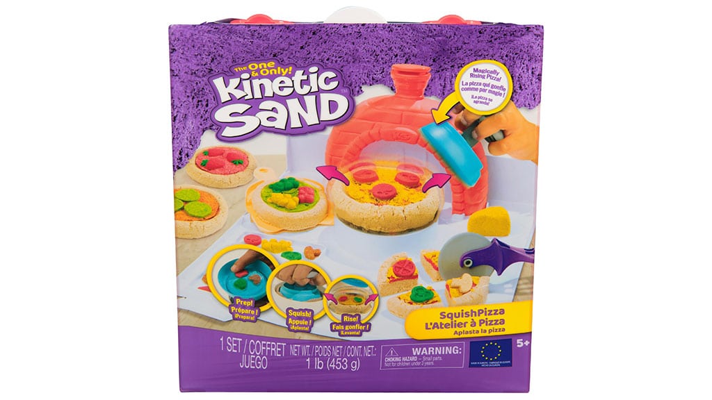 Children can construct their very own distinctive pizza mixtures utilizing 4 colours of kinetic sand and topping molds, then pop them into the fake pizza oven to observe them “rise.”