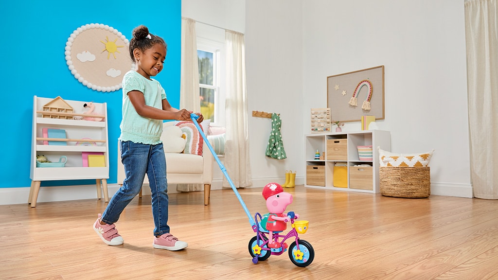Peppa Pig, Prepared, Pedal, Go Peppa ($39.99) helps youngsters information Peppa as she learns to journey a motorcycle. | Supply: Hasbro