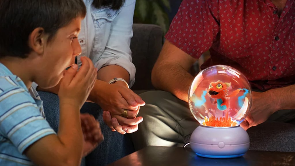 Synthetic Imagery’s Imagix Crystal Ball is a kid-forward synthetic intelligence (AI) toy. The crystal ball options two interactive holographic characters, Ellie the Fairy and Ember the Dragon, which seem by LED lights and 3D imagery. Households can ask Ellie and Ember to inform them tales, train them about varied matters, create poems, play trivia video games, and extra. As children converse with the AI-driven characters, each Ellie and Ember will mould to their language, concepts, and creativeness.