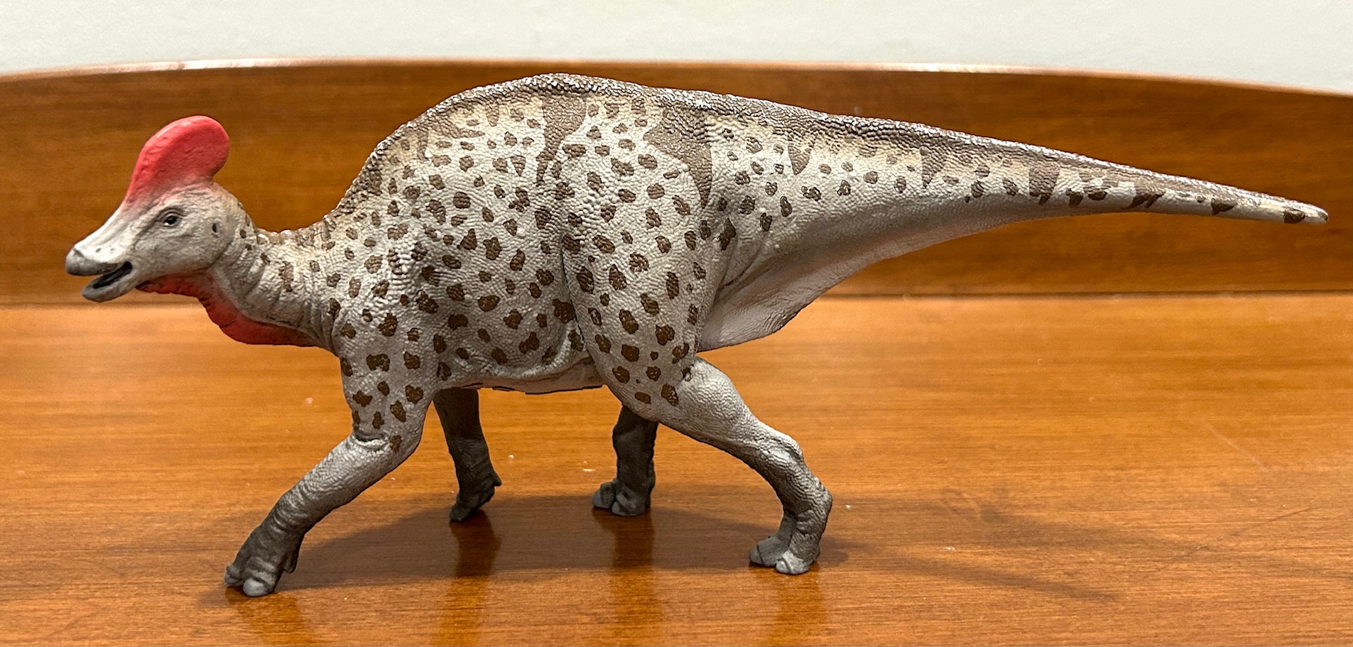 The Magnapaulia’s primary color is a light-weight gray with a good lighter underbelly. The fingers and ft are darkish gray with medium gray claws. Medium brown spots and stripes adorn the physique and white wash has been utilized down the size of the backbone. The invoice is medium gray with brown wash and the eyes are shiny black. And eventually, the crest and the throat are decked out in pastel purple. All of it seems to be good and it’s fairly not like any earlier CollectA ornithopod.