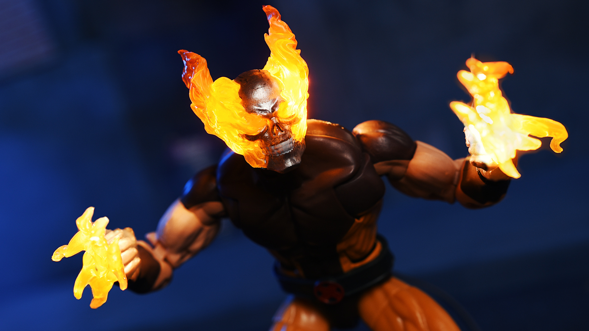 The paint is fairly commonplace legends fare, although there’s a slight misalignment to the white enamel that I feel may benefit from a wash, however I like the shiny metallic cranium and the orange/crimson lowlights on the flames. I do kinda miss the arm hair. Perhaps it burned off. Heh.