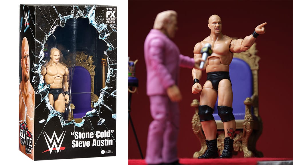 Rounding out the reveals is a “Stone Chilly” Steve Austin motion determine, the newest addition to the WWE Elite Assortment. Celebrating the thirtieth anniversary of his King of the Ring coronation, this set recreates the fateful 1996 interview during which Austin first used his soon-to-be legendary “Austin 3:16” catchphrase. The determine comes with two outfits — his wrestling garb and an Austin 3:16 tee — in addition to the throne, crown, and crown’s desk to set the scene.