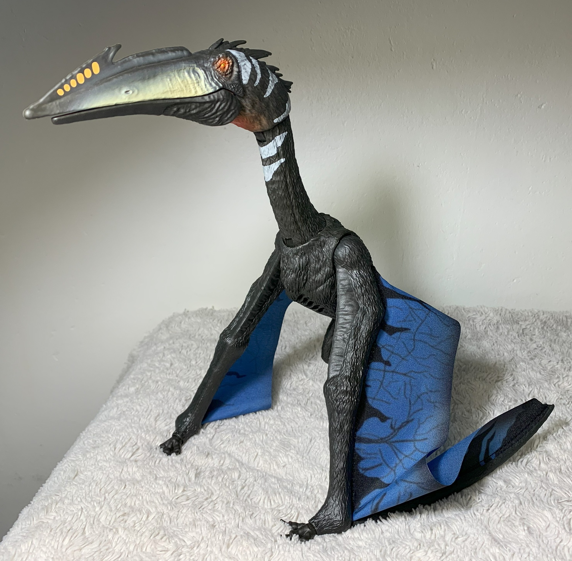 I do must level out that the toy will not be movie correct although. The Quetzalcoatlus within the film has a shorter and wider invoice that’s orange. It additionally has blue markings operating down the neck and the wing membranes are blue on the skin floor and purple on the within. The toy extra carefully matches the render idea of the animal and since toys are sometimes put into manufacturing earlier than designs are finalized, inconsistencies in design are to be anticipated. Contemplating that the wings are cloth, I don’t assume we should always have anticipated them to show two totally different colours anyway.