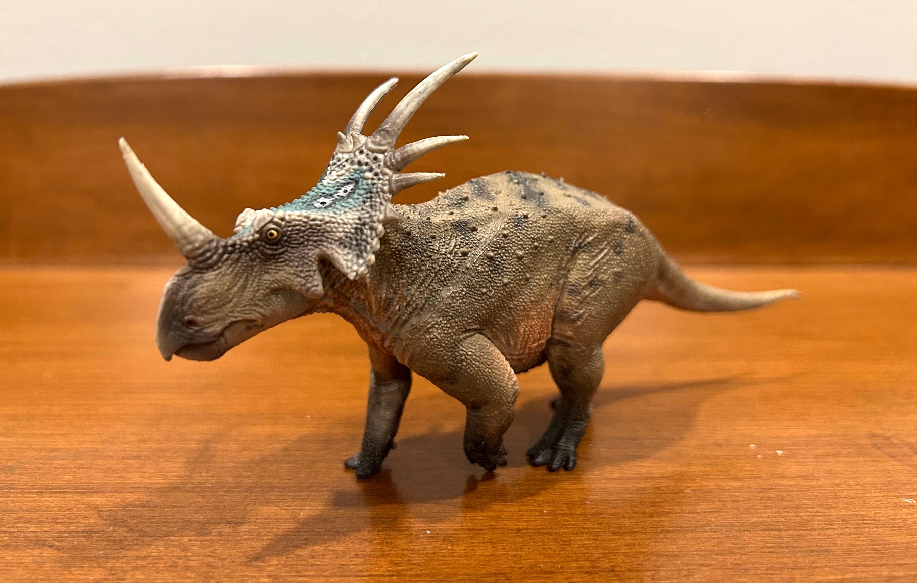 Particularly not with that nasal horn, which is impressively lengthy, grooved, and really pointy on the tip. The massive beak is easy, whereas the cranium is roofed in tiny scales. Small ridges are current atop the attention sockets and the frill is roofed in bigger, bumpier scales. And naturally, rising out of the rim of the frill are the attribute parietal spikes, the 2 topmost of that are even longer than the nasal horn. All these spikes are simply as pointy too. That is most assuredly not a toy for the aichmophobic.