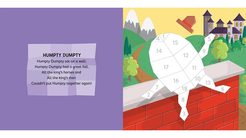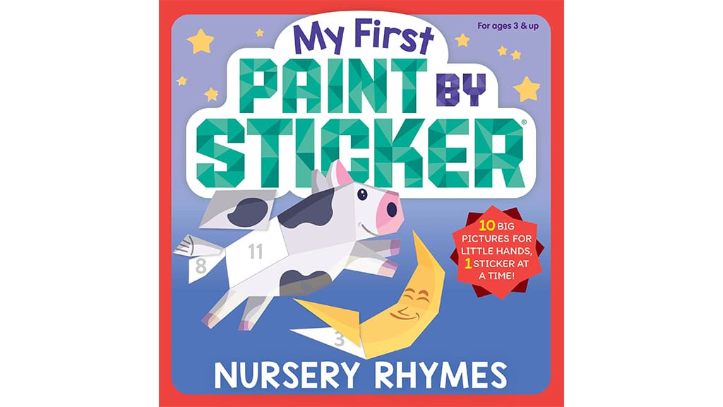This paint-by-sticker ebook options basic nursery rhymes like “Humpty Dumpty,” “Jack and Jill,” “Hickory Dickory Dock,” and extra. The ebook options 10 massive photographs for small arms and nursery rhymes on the again of every web page.