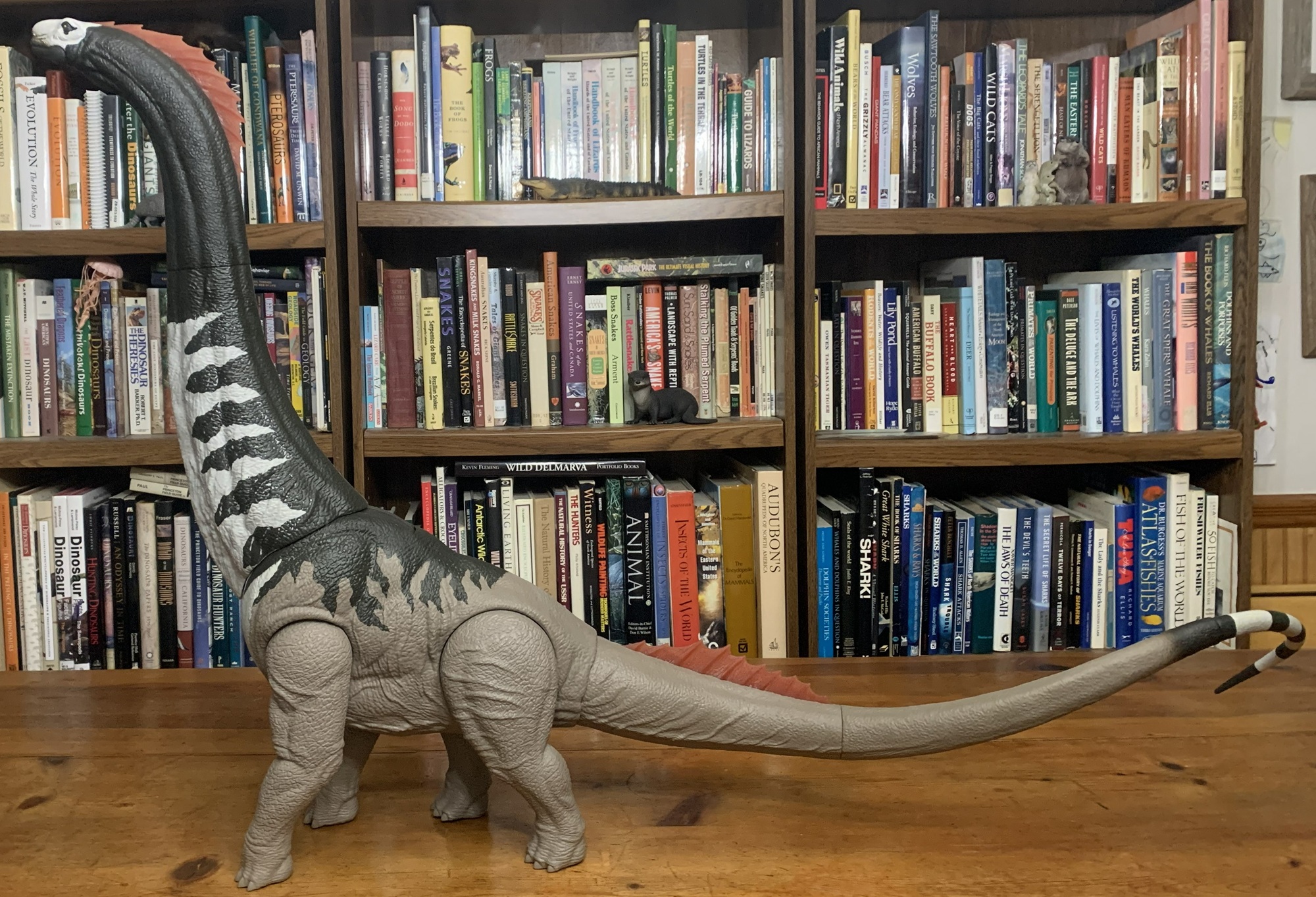 Right this moment we’re Mattel’s Titanosaurus motion determine, a part of their line of gigantic sauropod toys. I’ve a love/hate relationship with these toys as a result of whereas they’re magnificent to behold they’re preposterously giant and onerous to show. They’re costly too, and I at all times inform myself that I’ll solely get one in the event that they go on sale they usually inevitably at all times do. They’re additionally a ache to {photograph} for these critiques! For this one I needed to rearrange my complete eating room! I used to haul them outdoors however that was much more of a trouble.