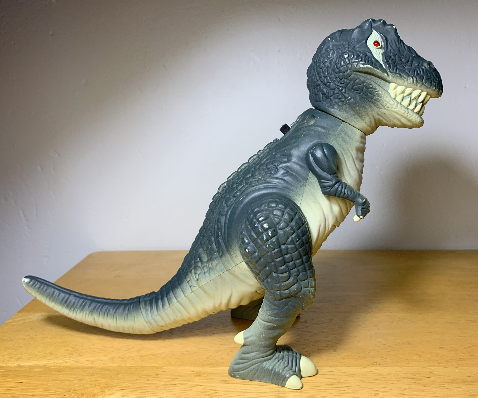 The Scarface toy was made in 1992 by Tiger Toys. He stands about 7.5” (19.05 cm) tall and a change on the again makes his eyes glow crimson and repeatedly roar a Godzilla-esq roar. His arms transfer up and down, and his head turns left and proper. My daughter says that it’s creepy and “demonic” regardless of a shelf in my room overflowing with dinosaur motion figures. It makes for a neat little animatronic, however the roar shortly will get annoying. It’s form of odd that each the eyes glow when considered one of them is meant to be blind nevertheless it’s greatest to not overthink these items.